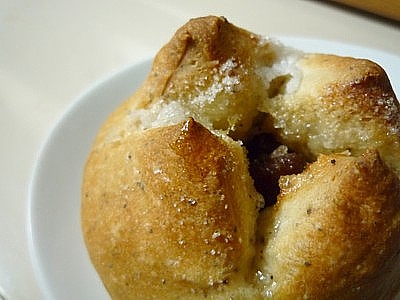 ドライイチジクを紅茶でふやかして、 牛乳で捏ねた生地で、包み込む。 生地にはチャイの茶葉を入れたけど、全くわからず。。 焼き上げ後に、カット部分にバターを一切れ 置いておいたので、とろけたバターが イチジクにしみこんで、かなりの美味