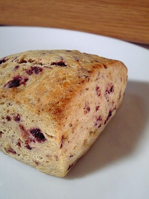 ドライチェリー&胡桃のスコーン。 今回は、酵母と卵、牛乳を先に混ぜておいてから、 生地に合わせる方法で。 仕上がりは、さっくりとしっとりで、なかなかいい感じ。 でも甘みがちょっと少なかったかな~。