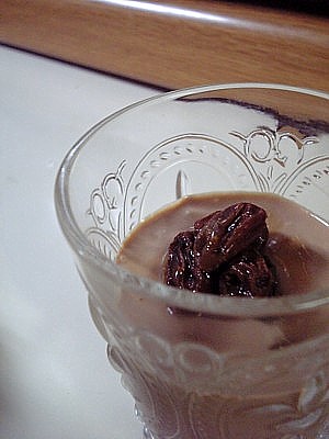 熱くしたコーヒーにチョコレートとふやかしたゼラチンを入れて 溶かし、クリームチーズと混ぜて固めたもの。 暖かい時はあっさりしすぎたかな。。と思ったけど、 冷やし固まったものは、わりと濃厚で、もったりとしてるところが なかなかおいしかった