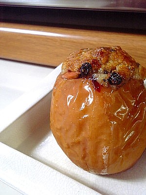 夜デザートの焼きりんご。 芯をくりぬいて(底は残して)、中にアーモンドプードル+粉砂糖を牛乳で 練ったものをベースにドライフルーツなどあるもの詰めて、 オーブンで40分ほど焼くだけの簡単焼きりんご。 あっさりしているので、とっても食べやすい 今回はマロングラッセやカレンズを入れてみた。 甘さも濃くも程よくって、食べやすい焼きりんご