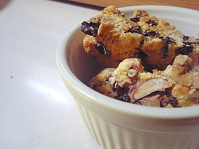 初めて、ビスコッティを焼いてみる。 とっても簡単で、好きなものをぽいぽいと入れられる手軽さがとってもいい! 調子に乗って、ドライフルーツやらナッツやらを放り込んでいたら どうも入れすぎたみたい カットするときちょっとバラけてしまった。 次回はトッピングをもう少し減らすか、生地をしっとり目で作ってみよう~。