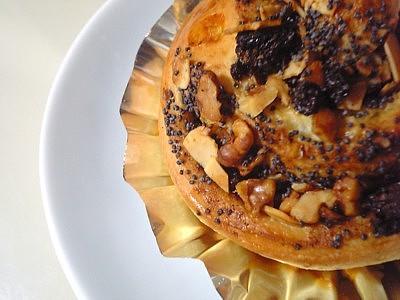 バター&卵入りのリッチ生地に ナッツをいろいろと巻き込んでみた。 これがなかなかうまく行って、 とっても好みの味に! トッピングにクリームチーズをつけるとさらにおいしいっ