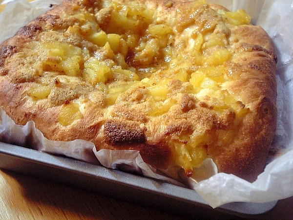 本屋でチラ見した、なんたら・クーヘンと言うドイツ風イーストを使ったお菓子をイメージ。しかし、お菓子と言うよりは生地がふっくらしていて、パンっぽい仕上りに。。でも生地の回りは、割りとサックリとしていていてお菓子っぽい??