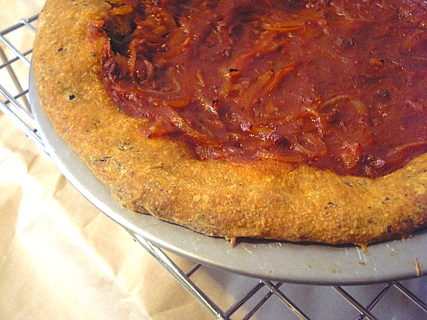 結構薄く延ばし、最終発酵ナシで焼き上げたので、表面はパリッ!+噛み応えはもっちり!で、とってもおいしかった☆オーリーブの苦味もうまく効いていて入れて正解!
